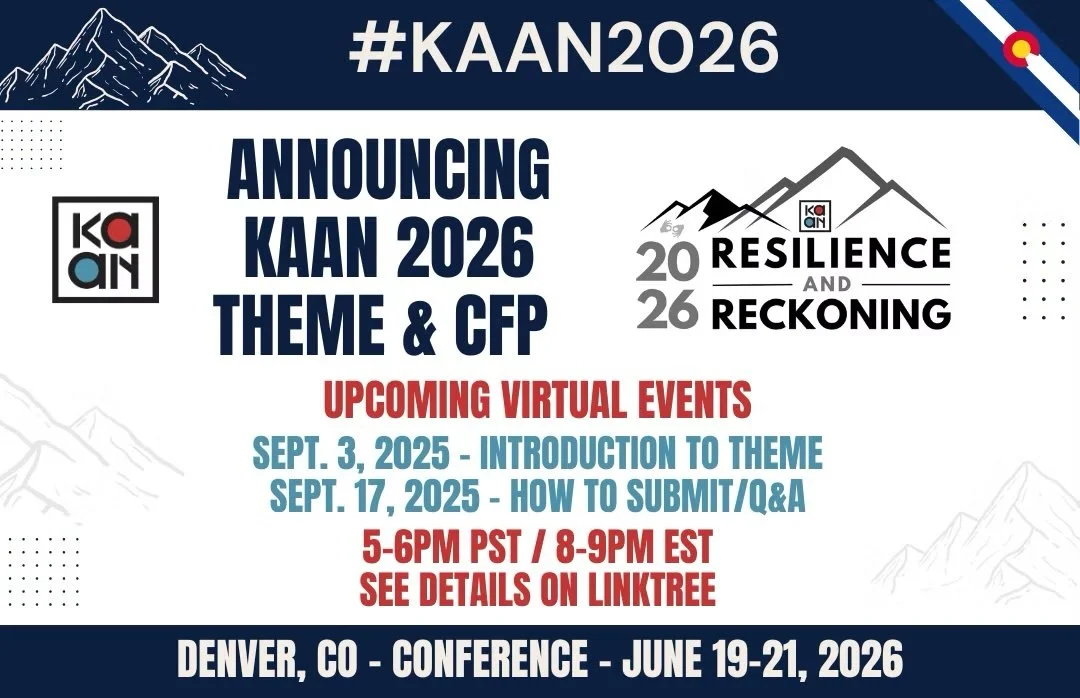 The KAAN 2026 Call for Proposals is now open! Themed Resilience and Reckoning, next year’s conference will be held June 19–21, 2026, at the Renaissance Denver Hotel & Conference Center. KAAN welcomes session proposals from adoptees, allies, and members of the adoption constellation that explore resilience, reckoning, and the connections between the two. Proposals are due by October 5, 2025, with notifications sent in early November. Learn more at at KAAN’s website.